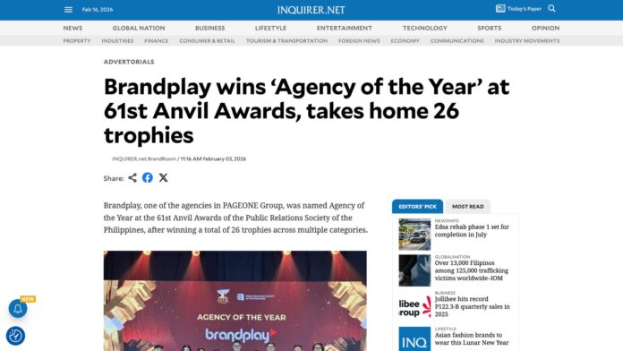 Brandplay, one of the agencies in PAGEONE Group, was named Agency of the Year at the 61st Anvil Awards of the Public Relations Society of the Philippines, after winning a total of 26 trophies across multiple categories.