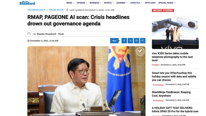 The Reputation Management Association of the Philippines (RMAP) today released the results of a three-month national media scan conducted by PAGEONE Analytics and Insights (PAGEONE AI), revealing that crisis- and scandal-driven stories have almost completely overshadowed the Marcos administration’s broader governance agenda.