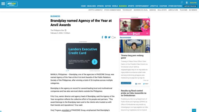 Vonj Tingson, president of PAGEONE Group, emphasized that Brandplay’s achievement reflects the broader culture of excellence within the network. “Brandplay’s Agency of the Year win is a proud moment for the entire PAGEONE Group,” Tingson said.
